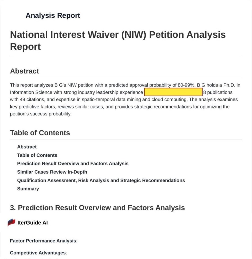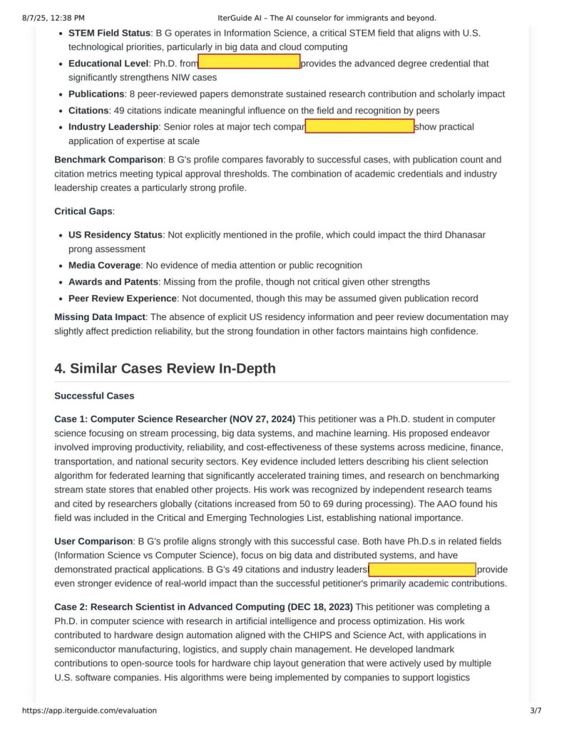 Using data from thousands of real-world cases, the tool compares your background against both successful and failed EB1A cases in your field. It provides a clearer view of how your profile aligns with actual outcomes, offering insights that go beyond checklist or generic advice.
