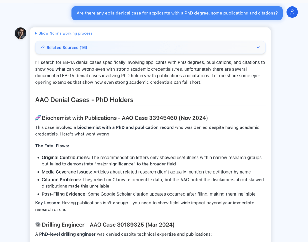 Whether you just begin or responding RFE , Nora is here to assist with personalized guidance, insightful analysis , proven strategies to guide you every step of your application.