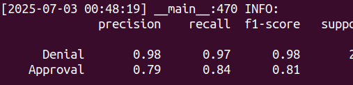 If you’re not a data expert, you’re likely asking: what do these numbers mean? In plain English, our AI/ML model performs very well for denial cases (weak profile), with 97%+ accuracy.